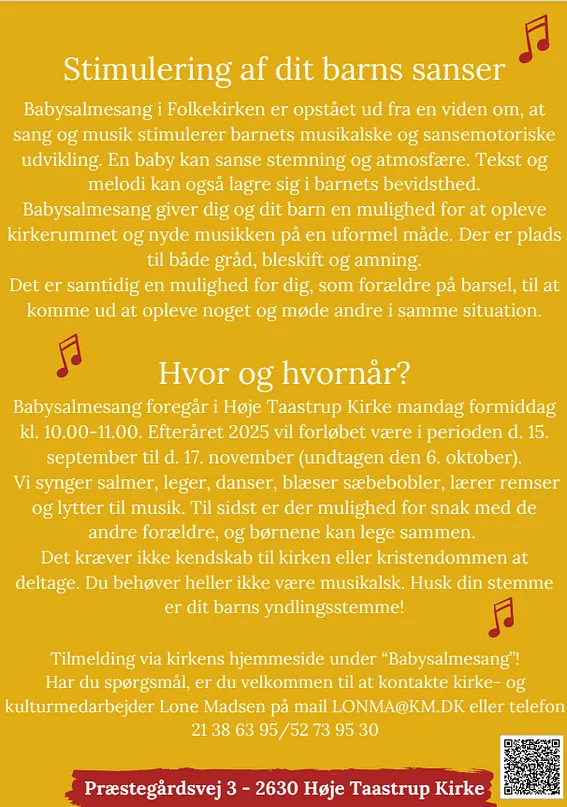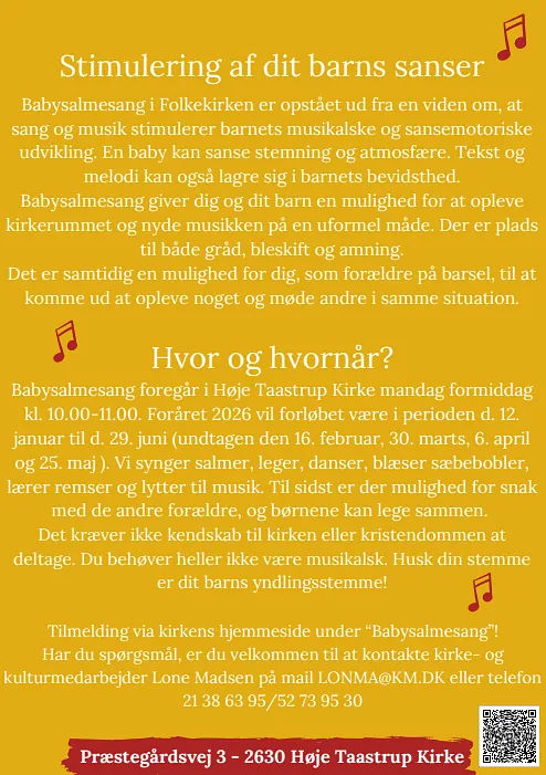 Hvis ud og dit barn har lyst til at være med til babysalmesang, kontakt kirke-og kulturarbejder Lone Madsen på mail: lonma@km.dk eller mobilnr.: 21 38 63 95.
